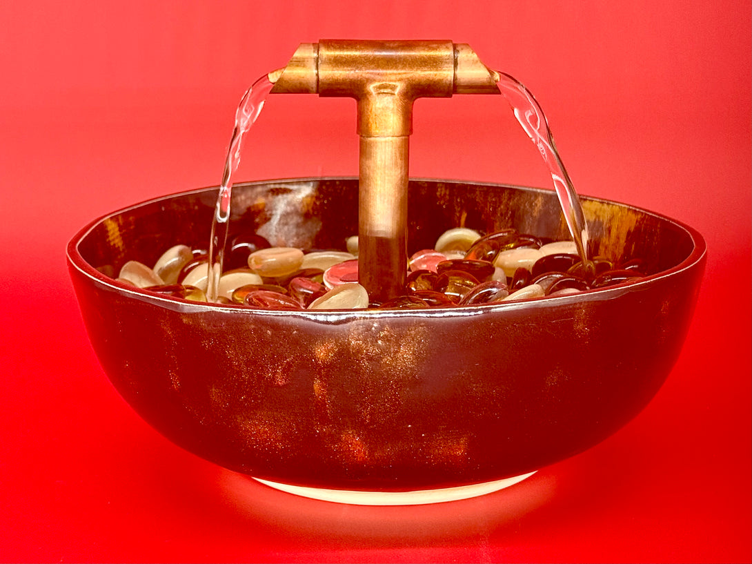 Add a touch of serenity and artistry to any space with this one-of-a-kind, hand-built ceramic tabletop fountain. Water gently flows from a custom-designed copper top, creating a soothing sound that enhances relaxation and ambiance. Perfect for desks, side tables, or meditation corners, this compact fountain blends functional tranquility with timeless design.