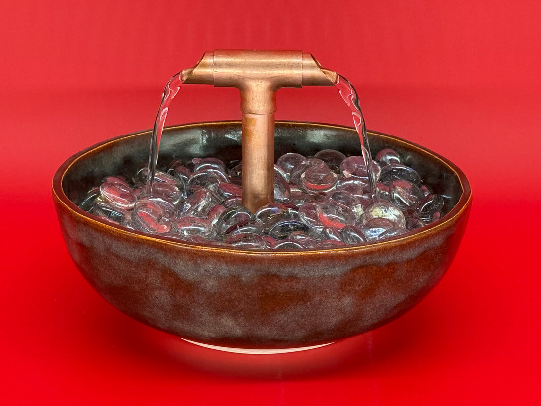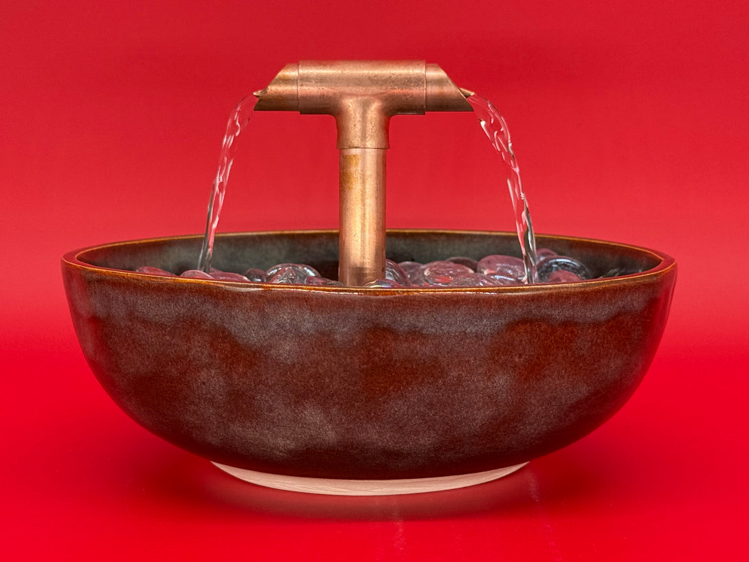 Add a touch of serenity and artistry to any space with this one-of-a-kind, hand-built ceramic tabletop fountain. Water gently flows from a custom-designed copper top, creating a soothing sound that enhances relaxation and ambiance. Perfect for desks, side tables, or meditation corners, this compact fountain blends functional tranquility with timeless design.
