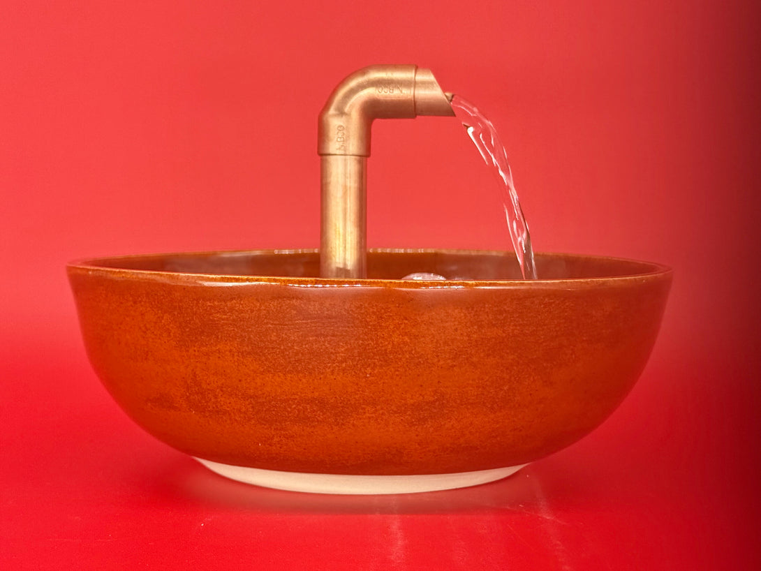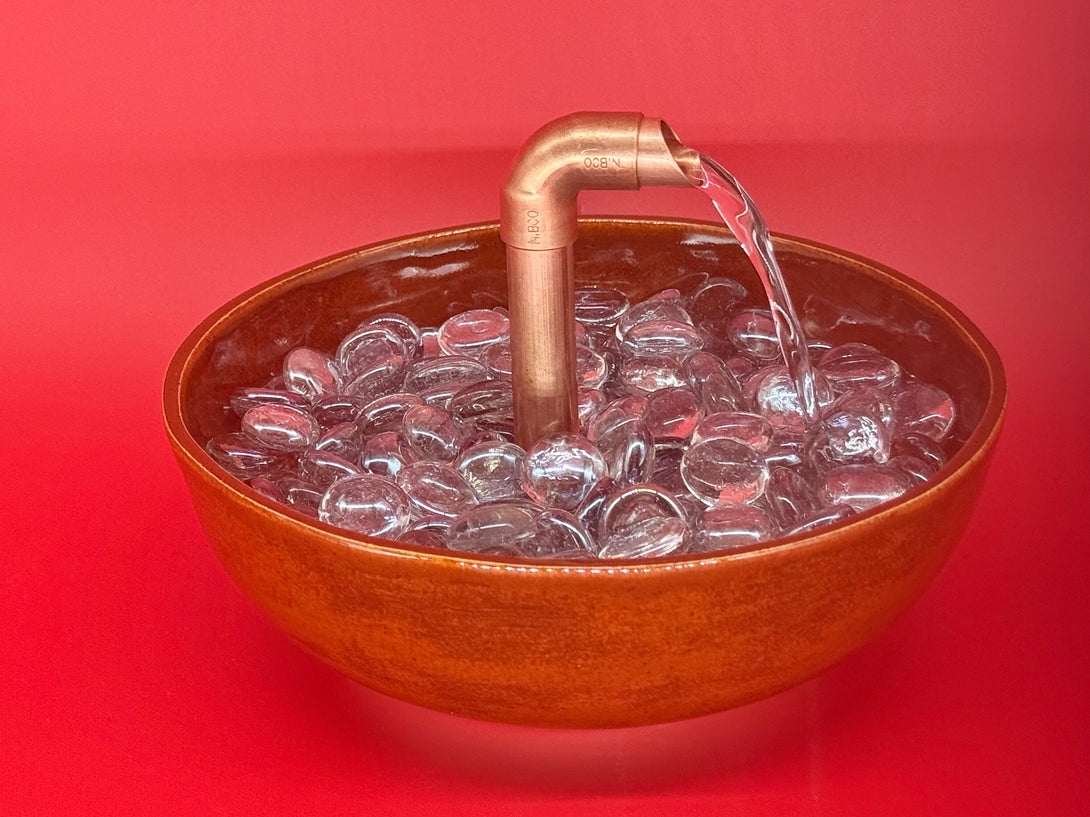 Add a touch of serenity and artistry to any space with this one-of-a-kind, hand-built ceramic tabletop fountain. Water gently flows from a custom-designed copper top, creating a soothing sound that enhances relaxation and ambiance. Perfect for desks, side tables, or meditation corners, this compact fountain blends functional tranquility with timeless design.